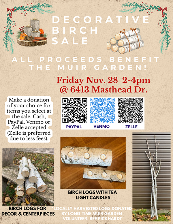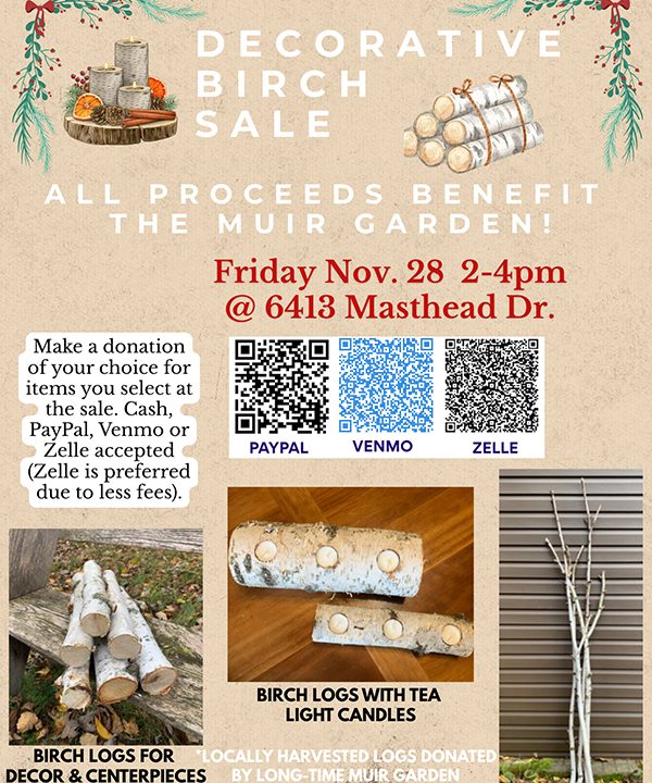 Holiday Decorative Birch Benefits Muir Garden This Friday Only Sale Of Natural Birch Decorations Benefit the Muir Garden Purchase beautiful decorations on Black Friday. 2 HOURS ONLY! To learn more about the Muir Garden, visit https://donate.seedmoney.org/11892/muir-elementary-school-garden Copyright © 2025 Parkwood Hills Community Association, All rights reserved.